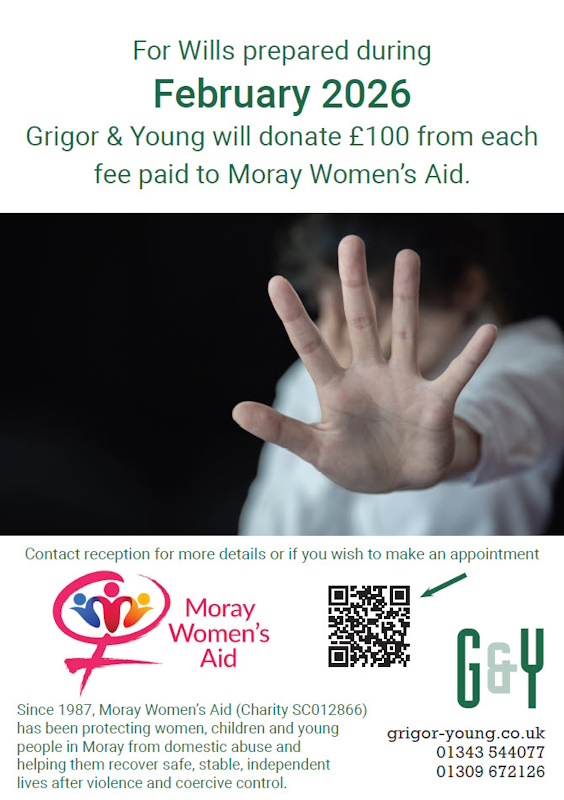 For February 2026, Grigor & Young LLP will be donating £100 from each fee for Will preparation to Moray Women’s Aid.