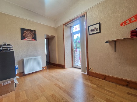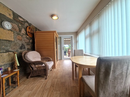 Fantastic bright room with optional uses, ideal office space, play room, guest bedroom etc. laminate flooring; glazed uPVC door leading onto the decked area to the front aspect; wall mounted shelving; space for a range of furniture.