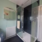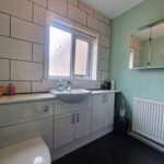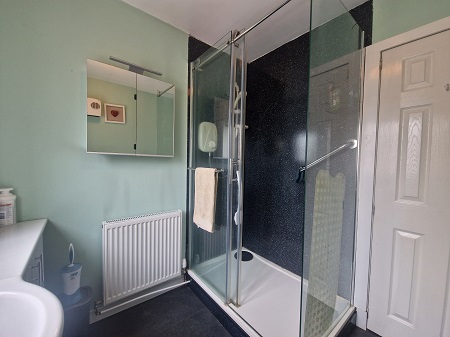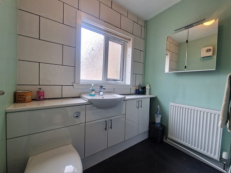 Walk-in shower enclosure with an electric shower; wet walled within; WC & wash hand basin set within a storage unit; laminate worksurface; tiled around wet areas; fixtures & fittings; wall mounted mirrored cabinet with lighting above and shaver socket within; wall mounted electric heater; translucent window to the side aspect fitted with a roller blind; laminate flooring.