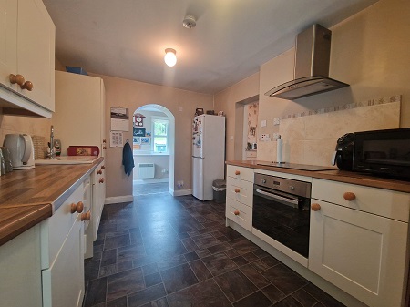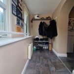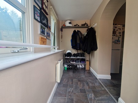 Upvc partially glazed door opening into a substantial and bright vestibule; space for furniture; double windows to the rear aspect fitted with a roller blind; wall mounted coat hooks & shelving; vinyl flooring; arch leading through into the kitchen.