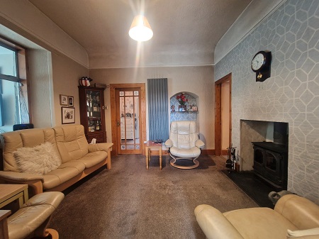 Warm and homely lounge, situated in the centre of this home; carpeted flooring; space for a range of furniture; multi-fuel stove with back boiler, with a slate hearth; 2 alcoves with shelving inset; window into the conservatory; doors to main hallway, study and bedroom 2.
