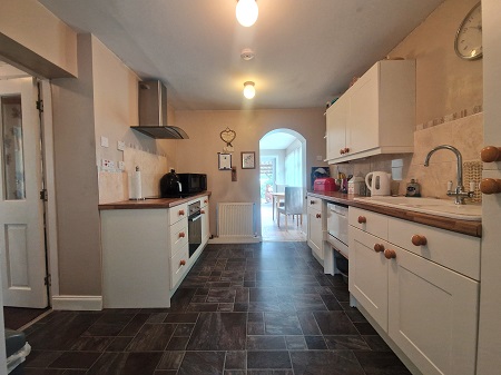 White wooden wall mounted & base units with laminate worksurfaces; ceramic sink set within, with mixer tap; integrated hob, oven & extractor; space for free-standing fridge freezer and an under-counter appliance; tiled around worksurfaces; arch leading into the conservatory; vinyl flooring.
