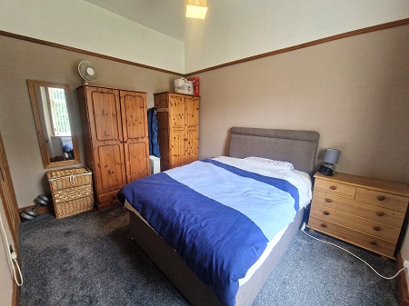 King-size bedroom with space for a range of furniture; carpeted flooring; built-in shelved cupboard; window to the front aspect fitted with vertical blinds.