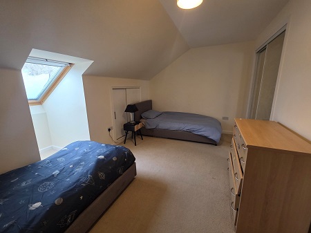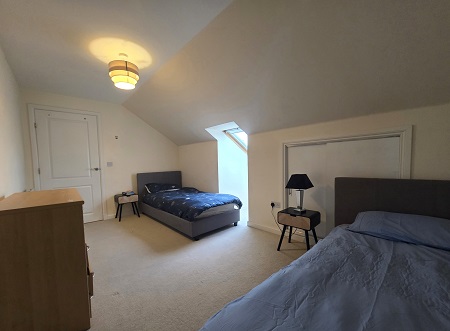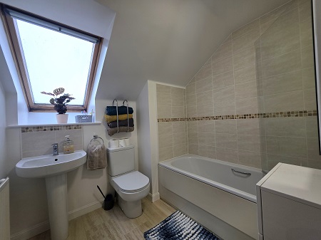 Bright and spacious family bathroom; bath with an overhead mains’ shower; fully tiled around wet areas; glass shower screen; WC; pedestal wash hand basin; water resistant laminate flooring; Velux window fitted with Velux blind; wall-mounted mirror; 2 x storage units – included.