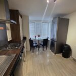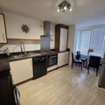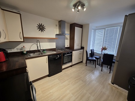 Selection of modern cream and dark wood-effect base and wall-mounted units with a laminate work surface; sink set within with a mixer tap; integrated gas hob, oven and extractor; free-standing dishwasher and washing machine/dryer – both included in the sale; wall-mounted shelf; water resistant laminate flooring; boiler located within a wall- mounted cupboard; bay window to front aspect, fitted with venetian blinds; space for a dining table and chairs.
