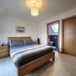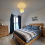 King-size bedroom with en-suite shower room & dressing room; large double tilt & open windows with sea views, space for a range of furniture; carpeted flooring; walk-in dressing room with a selection of shelving & clothes rails, and lighting within.