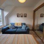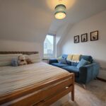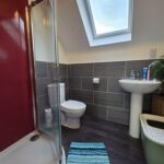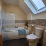 Capacious bathroom; bathroom with a mains’ shower over-head; shower screen; heated towel rail; tiled around wet areas; wall mounted mirror; shaver socket; tiled flooring; velux window.