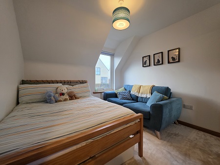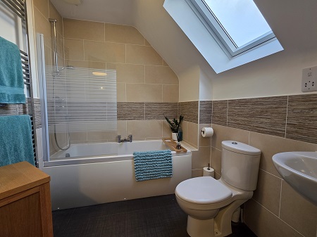 Capacious bathroom; bathroom with a mains’ shower over-head; shower screen; heated towel rail; tiled around wet areas; wall mounted mirror; shaver socket; tiled flooring; velux window.