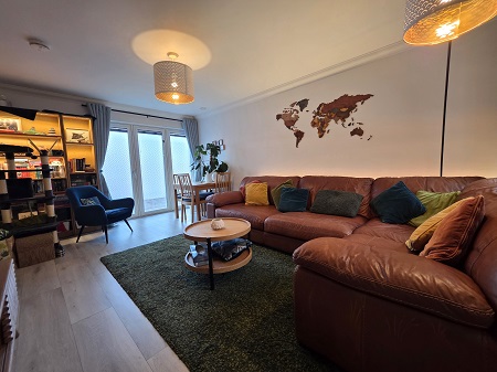 Composite door opening into an entrance hallway; laminate flooring; doors to lounge, bedroom 1 & guest WC/utility; storage cupboard.