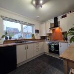 Delightful kitchen fitted with light cream wall mounted & base units; wood effect laminate worksurfaces; 1 & ½ sink set within; integrated gas hob, oven, fridge freezer & extractor; splash back; free-standing dishwasher – included; gas boiler within a wall mounted cupboard; window to the rear aspect fitted with a roller blind; space for free-standing furniture; rear external door; vinyl tiled flooring.