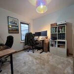 Ground floor bedroom, currently used as an office; space for a range of furniture; water tank within cupboard; carpeted flooring; large window to the rear aspect, fitted with integrated venetian blinds.