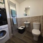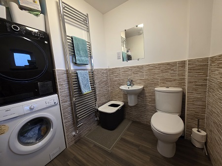 Spacious guest WC located on the ground floor; laminate flooring; WC; wall mounted wash hand basin; heated towel rail; space for stackable utility appliance’s - included; translucent window to the front aspect; fully tiled, ½ height.