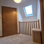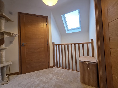 Bright upper hallway; carpeted flooring; doors to bedrooms 2 & 3, and family bathroom; velux window.