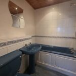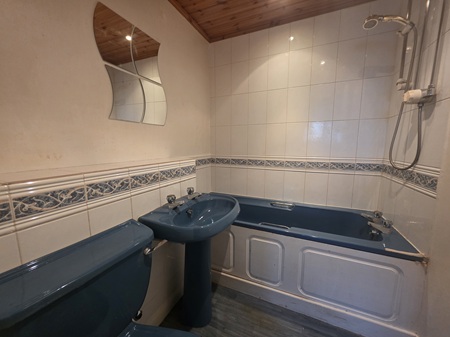 Bath with an overhead mains’ shower; WC; pedestal wash hand basin; tiled around wet areas; extractor; fixtures & fittings; vinyl flooring.