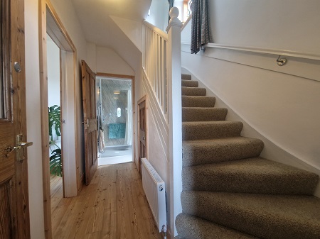 Wooden door with translucent panel opens into the entrance vestibule; electricity meter & consumer unit are wall mounted at ceiling height; space for furniture; internal wooden, partially glazed door leading into the lower hallway; solid wood flooring; doors to the lounge & shower room; under stairs storage cupboard; carpeted stairs to the first floor.