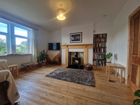 A lovely, bright & relaxing lounge with space for a range of furniture; wood burning stove set within a wooden surround, with a slate hearth; large window to the front aspect; built-in bookcase.