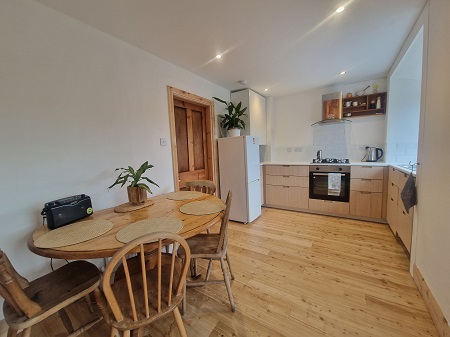 Selection of wall mounted & base units with white laminate worksurfaces; stainless steel sink with mixer tap; integrated gas hob, oven, extractor & dishwasher; free-standing fridge freezer which is included; space for a table & chairs; spotlights inset; window to the rear aspect fitted with a roller blind; solid wood flooring; doors to the lounge, utility room & sun room.