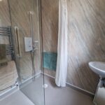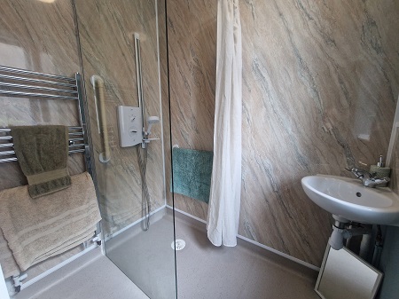 Ground floor shower room consisting of: - walk in shower enclosure with an electric shower with shower screen; wet walled around wet areas; WC; wall mounted wash hand basin; heated towel rail; wall mounted mirrored cabinet; fixtures & fittings; wall mounted additional electric heater; vinyl flooring.
