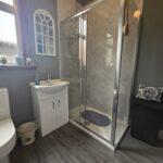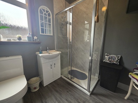 Ground floor, shower room; shower enclosure with an electric shower unit; wet walled around wet areas; WC; wash hand basin set within a storage unit; space for furniture; laminate flooring; translucent window to the rear aspect.