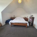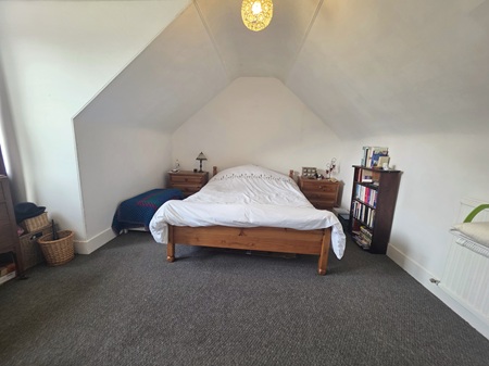 First floor, king-size bedroom; space for a range of furniture; carpeted flooring; dual aspect windows to the front & rear aspect fitted with venetian blinds; built-in cupboard – water tank, located within.