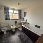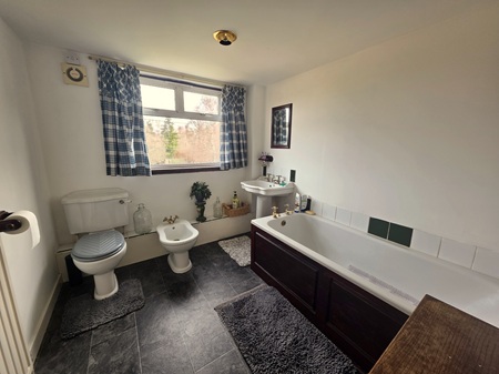 Bathroom with a suite consisting of: - W.C; pedestal wash hand basin; bidet; full-size bath; tiled around wet areas; window to the rear aspect; linoleum flooring; window to the rear aspect.
