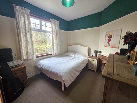 Rear-facing ground floor, double bedroom; space for a range of free-standing furniture; feature, historic fire surround; carpeted flooring; window to the rear aspect.