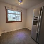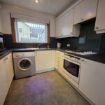 Selection of white, wall-mounted & base units; laminate work surfaces; stainless steel sink with mixer tap set within; splashbacks surrounding the work surfaces; integrated gas hob, oven & extractor; free-standing American fridge freezer & washing machine – included in the sale; dual-aspect windows to the front & rear aspects, fitted with vertical blinds; space for a table & chairs; vinyl tiled flooring.