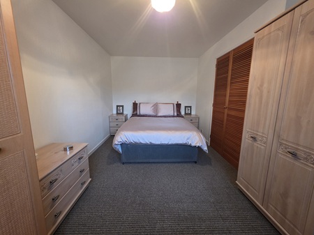 Double bedroom; window to the front aspect, fitted with vertical blinds; built-in storage cupboard with shelving – gas boiler within; space for furniture; built-in shelved linen cupboard; carpeted.