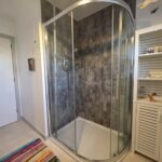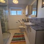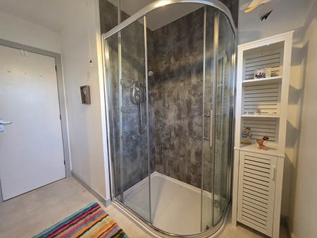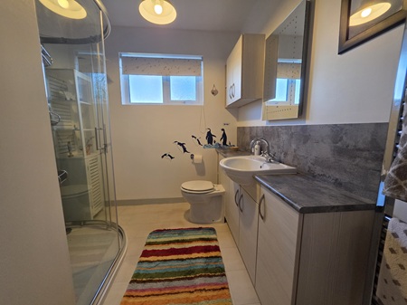 Modern shower room; spacious shower enclosure with an electric shower unit; WC & wash hand basin set within a storage unit, with matching wall mounted storage cupboard; heated towel rail; LED wall mounted mirror; translucent window to the rear aspect; vinyl flooring.
