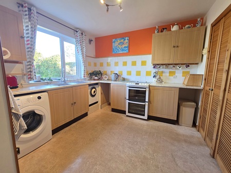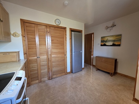 Great selection of wall-mounted and base units; laminate work surfaces; stainless-steel sink set within; tiled around work surfaces; built-in shelved pantry; free-standing electric cooker, washing machine, fridge freezer – included; space for a small table & chairs; fixtures & fittings; window to the rear aspect; vinyl flooring.