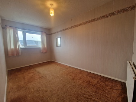 Double bedroom; carpeted flooring; space for furniture; window to the front aspect; built-in wardrobe with shelving & hanging rail.