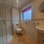 Corner shower enclosure with a mains’ shower; WC; corner wash hand basin within a storage unit; shaver socket; fully tiled; wall mounted storage cupboard & mirror; fixtures & fittings; heated towel rail; extractor; spotlights inset; translucent window to the side aspect fitted with a roller blind; vinyl flooring.