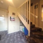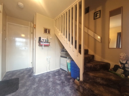 uPVC door with translucent glazed panels opening into a spacious lower hallway; carpeted; space for furniture; doors to the lounge and kitchen; two capacious storage cupboards, both with lighting, shelving and wall mounted coat hooks – electricity meter and consumer unit within the first at bottom of stairs.