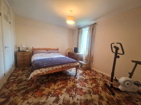 King-size bedroom; space for a range of furniture; carpeted; double windows to the front aspect; built-in double wardrobe with shelving & clothes rail; built-in storage cupboard with shelving and space for larger items.