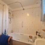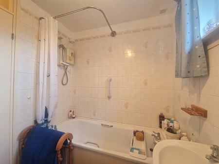 Bath with an overhead electric shower; WC; Wash hand basin; tiled around wet areas; extractor; fixtures & fittings; heated towel rail; wall mounted electric heater; carpeted flooring; translucent window to the rear aspect.