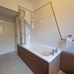 Located on the ground floor; bath with an overhead electric shower; bi-fold shower screen; WC; pedestal wash hand basin; heated towel rail; tiled around wet areas; extractor; fixtures and fittings; built-in shelved storage cupboard; translucent window to the rear aspect, fitted with venetian blinds.