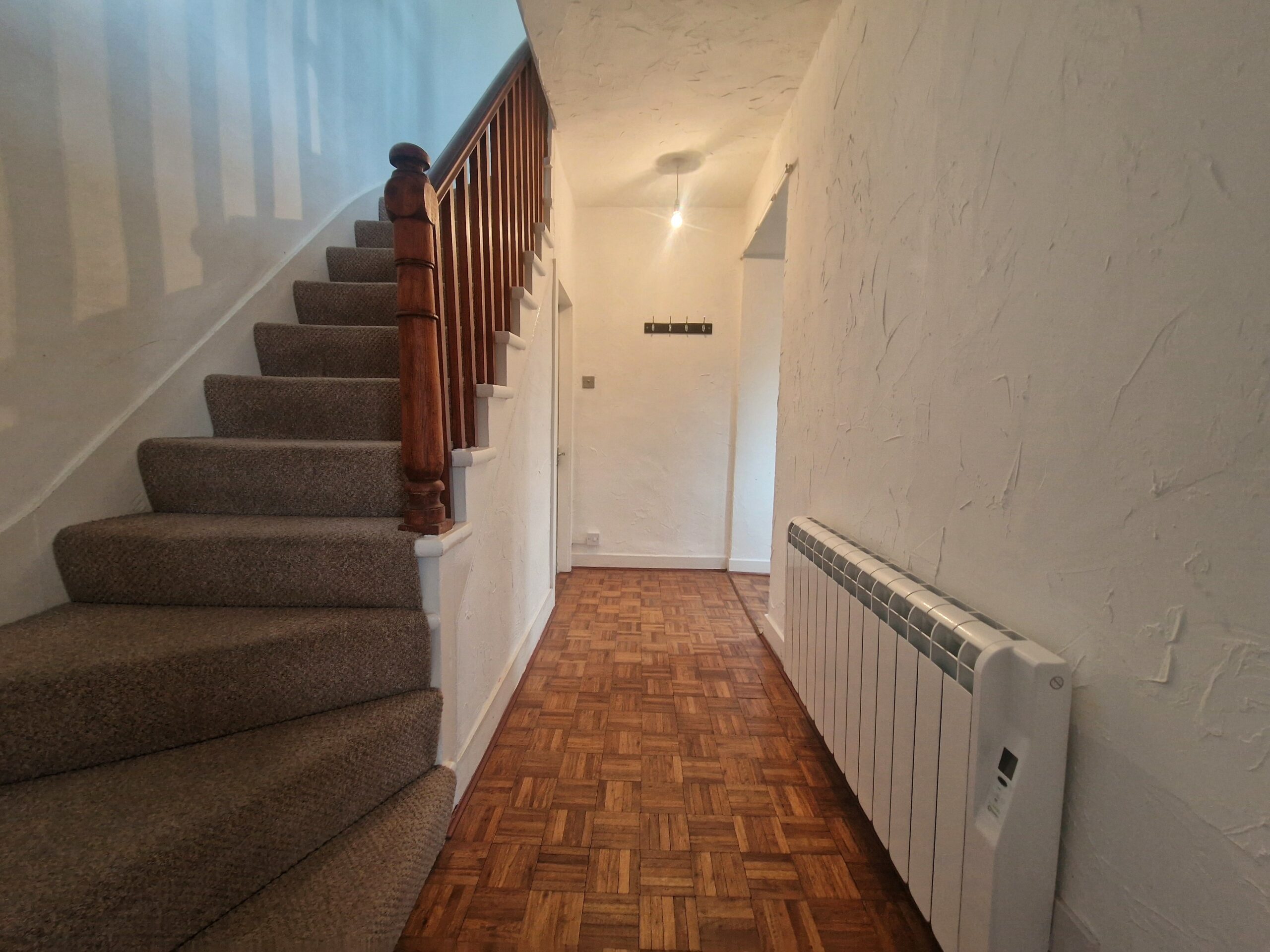 uPVC door with translucent panels; window to the side aspect; doors to lounge and bathroom; wooden parquet flooring; carpeted stairs to the first floor.