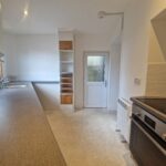 Selection of wall-mounted and base units; laminate work surfaces with a stainless steel sink within; tiled around work surfaces; wall-mounted shelving unit; integrated electric hob and oven; spotlights inset within the ceiling; space for a selection of appliances; rear external uPVC door; window to the rear aspect, fitted with a venetian blind, and overlooking the village church; vinyl flooring.