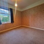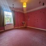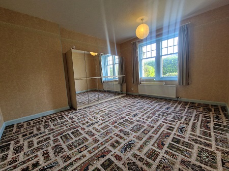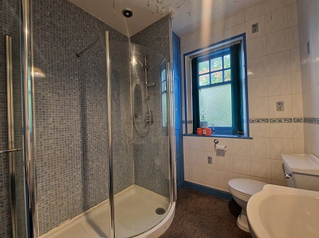 Spacious shower enclosure with a mains’ shower; WC; pedestal wash hand basin; fully tiled / wet walled; fixtures and fittings; built-in shelved cupboard; translucent window to the rear aspect; carpeted flooring.