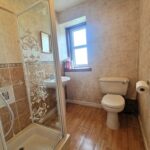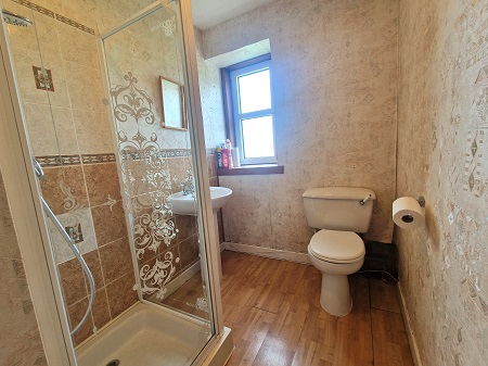 Situated on the ground floor; shower enclosure with a mains’ shower; tiled around wet areas; pedestal wash hand basin; WC; built-in shelved cupboard with hanging rails; laminate flooring; translucent window to the rear aspect.