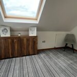 Capacious king-size bedroom with space for a range of furniture; carpeted flooring; dual-aspect Velux windows, fitted with integrated blackout roller blinds; built-in wardrobe with a selection of shelving and clothes rails.