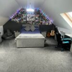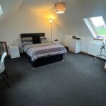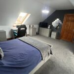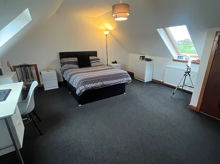 King-size bedroom with space for a vast selection of furniture; dual-aspect Velux windows with integrated blackout blinds; carpeted flooring; built-in double wardrobe with a selection of shelving and clothes rails; carpeted flooring.