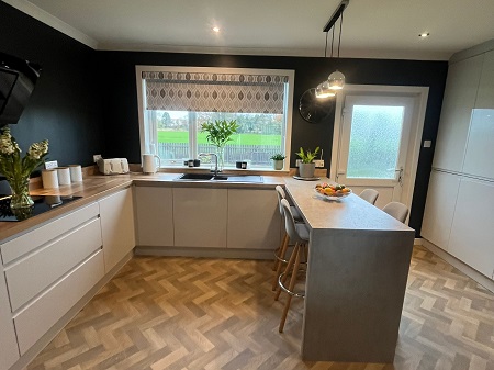 Beautiful and well thought-out fitted kitchen with a good selection of light grey gloss base and full-height units; laminate work surfaces and breakfast bar; 1½ sink with mixer tap, set within; selection of integrated appliances including: - fridge freezer, induction hob, oven, microwave, extractor and dishwasher; vinyl flooring; large window to the rear aspect, fitted with a roller blind; feature drop light fitting; spotlights inset; vertical radiator; rear uPVC partially-glazed door leading into the rear garden.