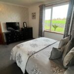 Ground floor king-size bedroom with space for a range of furniture; carpeted flooring; large window to the rear aspect with a lovely view over the field behind and beyond; built-in double wardrobe with mirrored sliding doors, a selection of shelving and clothes rails.