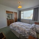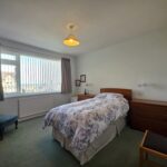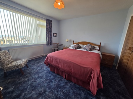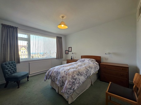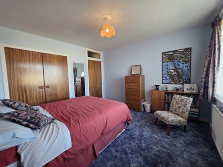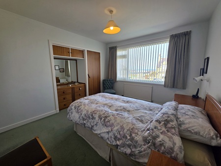 King-size bedroom with space for a selection of furniture; window to the front aspect with delightful sea views, fitted with vertical blinds; carpeted flooring; built-in double wardrobe with shelving & rails; wall mounted mirror.