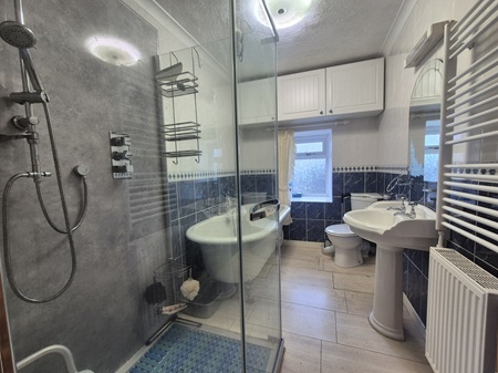 Fully tiled bathroom; large free-standing bath; spacious shower enclosure with a mains’ shower; WC; pedestal wash hand basin; fixtures & fittings; wall mounted storage cupboards; heated towel rail; wall mounted mirror & shaver light; translucent window to the rear aspect; vinyl flooring.
