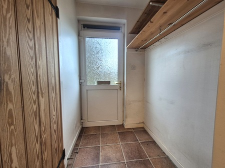 Laminate worksurfaces with space for a range of under-counter appliances; gas boiler; selection of wall mounted shelves; ceiling mounted pully; wall mounted safe; cloak rail & area ideal for shoe storage; vinyl flooring; doors to guest WC & kitchen; rear external partially glazed, upvc door.